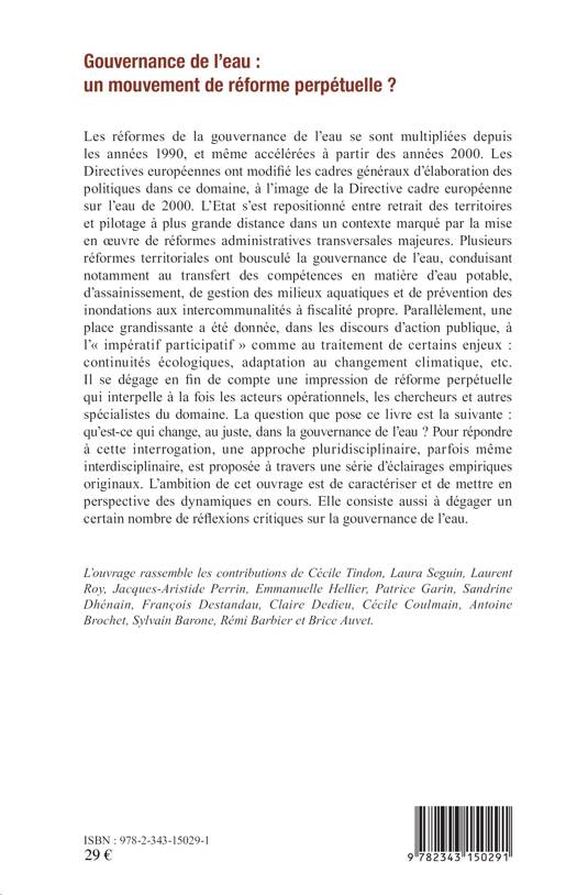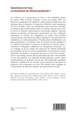 Les réformes de la gouvernance de l'eau se sont multipliées depuis les années 1990. Il se dégage une impression de réforme perpétuelle qui interpelle les acteurs opérationnels et les spécialistes du domaine. Qu'est-ce qui change au juste dans la gouvernance de l'eau ? Comment caractériser et mettre en perspective les dynamiques en cours ? Cet ouvrage aborde ces questions en développant des réflexions critiques sur la gouvernance actuelle de l'eau.