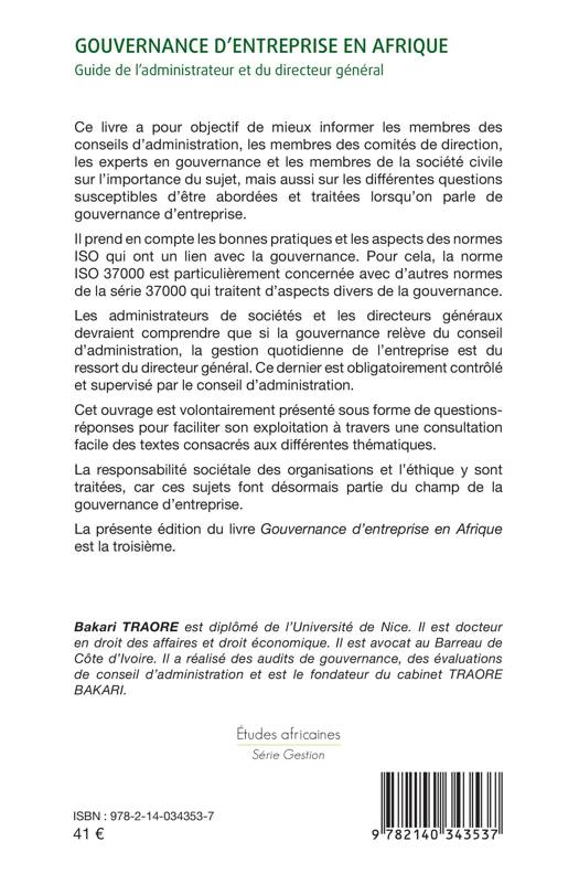 Ce livre a pour objectif de mieux informer les membres des conseils d'administration, les membres des comités de direction, les experts en gouvernance et les membres de la société civile sur l'importance du sujet, mais aussi sur les différentes questions susceptibles d'être abordées et traitées lorsqu'on parle de gouvernance d'entreprise. Il prend en compte les bonnes pratiques et les aspects des normes ISO qui ont un lien avec la gouvernance. Cet ouvrage est volontairement présenté sous forme de questions-réponses pour faciliter son exploitation à travers une consultation facile des textes consacrés aux différentes thématiques. La responsabilité sociétale des organisations et l'éthique y sont traitées, car ces sujets font désormais partie du champ de la gouvernance d'entreprise.
