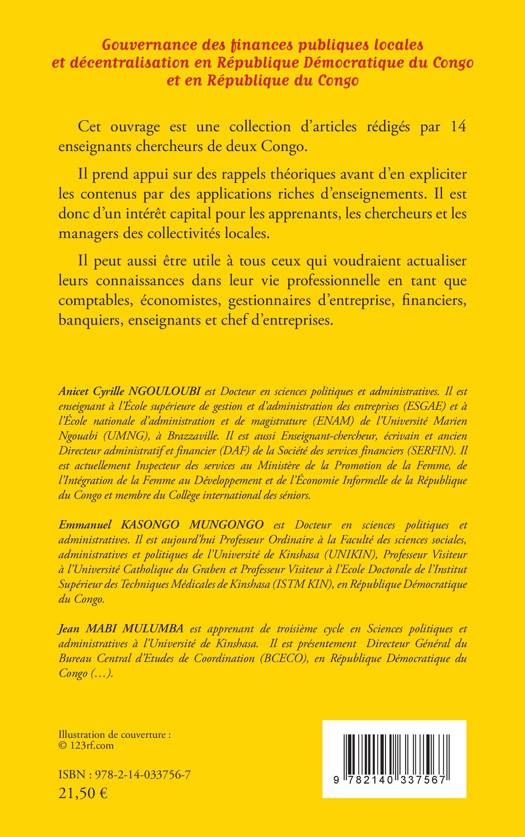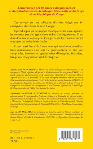 Cet ouvrage est une collection d’articles rédigés par 13 enseignants chercheurs de deux Congo. Il prend appui sur des rappels théoriques avant d’en expliciter les contenus par des applications riches d’enseignements. Il est donc d’un intérêt capital pour les apprenants, les chercheurs et les managers des collectivités locales. Il peut aussi être utile à tous ceux qui voudraient actualiser leurs connaissances dans leur vie professionnelle en tant que comptables, économistes, gestionnaires d’entreprise, financiers, banquiers, enseignants et chef d’entreprises.