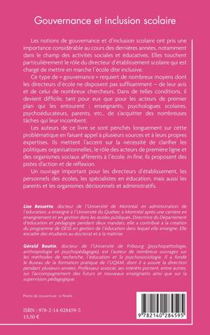 Les notions de gouvernance et d'inclusion scolaire ont pris une importance considérable au cours des dernières années, notamment dans le champ des activités sociales et éducatives. Elles touchent particulièrement le rôle du directeur d'établissement scolaire qui est chargé de mettre en marche l'école dite inclusive. Ce type de « gouvernance » requiert de nombreux moyens dont les directeurs d'école ne disposent pas suffisamment – de leur avis et de celui de nombreux chercheurs. Dans de telles conditions, il devient difficile, tant pour eux que pour les acteurs de premier plan qui les entourent : enseignants, psychologues scolaires, psychoéducateurs, parents, etc., de s'acquitter des nombreuses tâches qui leur incombent. Les auteurs de ce livre se sont penchés longuement sur cette problématique en faisant appel à plusieurs sources et à leurs propres expertises. Ils mettent l'accent sur la nécessité de clarifier les politiques organisationnelles, le rôle des acteurs de première ligne et des organismes sociaux afférents à l'école. In fine, ils proposent des pistes d'action et de réflexion. Un ouvrage important pour les directeurs d'établissement, les personnels des écoles, les spécialistes en éducation, mais aussi les parents et les organismes décisionnels et administratifs.