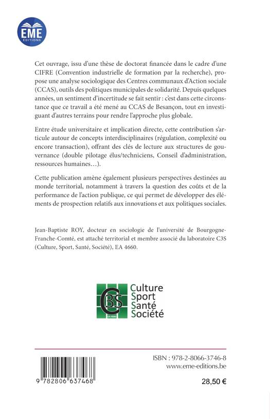 Cet ouvrage, issu d'une thèse de doctorat financée dans le cadre d'une CIFRE (Convention industrielle de formation par la recherche), propose une analyse sociologique des Centres communaux d'Action sociale (CCAS), outils des politiques municipales de solidarité. Depuis quelques années, un sentiment d'incertitude se fait sentir : c'est dans cette circonstance que ce travail a été mené au CCAS de Besançon, tout en investiguant d'autres terrains pour rendre l'approche plus globale.