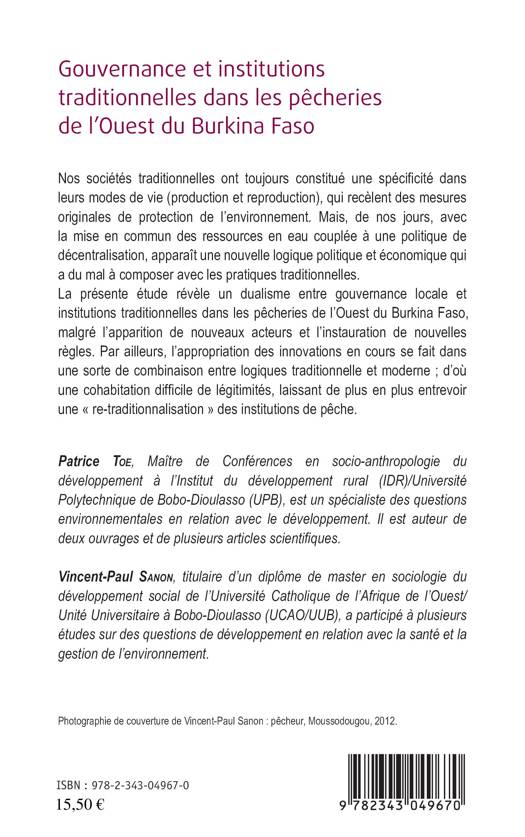 Cette étude révèle un dualisme entre gouvernance locale et institutions traditionnelles dans les pêcheries de l'Ouest du Burkina Faso, malgré l'apparition de nouveaux acteurs et l'instauration de nouvelles règles. Par ailleurs, l'appropriation des innovations en cours se fait dans une sorte de combinaison entre logiques traditionnelle et moderne; d'où une cohabitation difficile de légitimités, laissant de plus en plus entrevoir une "re-traditionnalisation" des institutions de pêche.