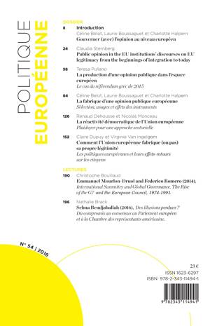 Au sommaire : Gouverner (avec) l'opinion au niveau européen/ Public opinion in the EU institutions' discourses on EU legitimacy from the beginnings of integration to today/ La production d'une opinion publique dans l'espace européen/ La fabrique d'une opinion publique européenne/ La réactivité démocratique de l'Union européenne/ Comment l'Union européenne fabrique (ou pas) sa propre légitimité