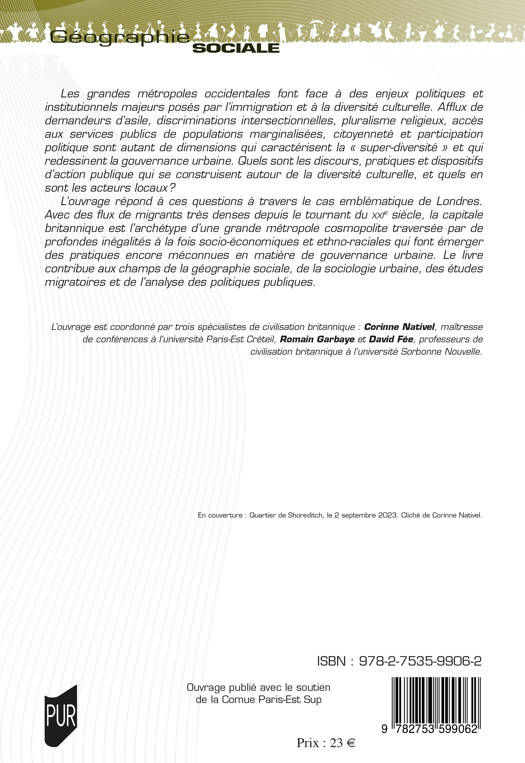Les grandes métropoles occidentales font face à des enjeux politiques et institutionnels majeurs posés par l’immigration et à la diversité culturelle. Afflux de demandeurs d’asile, discriminations intersectionnelles, pluralisme religieux, accès aux services publics de populations marginalisées, citoyenneté et participation politique sont autant de dimensions qui caractérisent la « super-diversité » et qui redessinent la gouvernance urbaine. Quels sont les discours, pratiques et dispositifs d’action publique qui se construisent autour de la diversité culturelle, et quels en sont les acteurs locaux ? L’ouvrage répond à ces questions à travers le cas emblématique de Londres. Avec des flux de migrants très denses depuis le tournant du XXIe siècle, la capitale britannique est l’archétype d’une grande métropole cosmopolite traversée par de profondes inégalités à la fois socio-économiques et ethno-raciales qui font émerger des pratiques encore méconnues en matière de gouvernance urbaine. Le livre contribue aux champs de la géographie sociale, de la sociologie urbaine, des études migratoires et de l’analyse des politiques publiques.