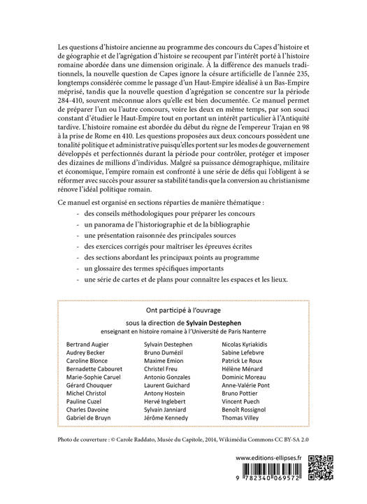 À la différence des manuels traditionnels, la nouvelle question de Capes ignore la césure artificielle de l’année 235, longtemps considérée comme le passage d’un Haut-Empire idéalisé à un Bas-Empire méprisé, tandis que la nouvelle question d’agrégation se concentre sur la période 284-410, souvent méconnue alors qu’elle est bien documentée. Ce manuel permet de préparer l’un ou l’autre concours, voire les deux en même temps, par son souci constant d’étudier le Haut-Empire tout en portant un intérêt particulier à l’Antiquité tardive. L’histoire romaine est abordée du règne de l’empereur Trajan en 98 à la prise de Rome en 410. Les questions proposées aux deux concours possèdent une tonalité politique et administrative puisqu’elles portent sur les modes de gouvernement développés et perfectionnés durant la période pour contrôler, protéger et imposer des dizaines de millions d’individus.
