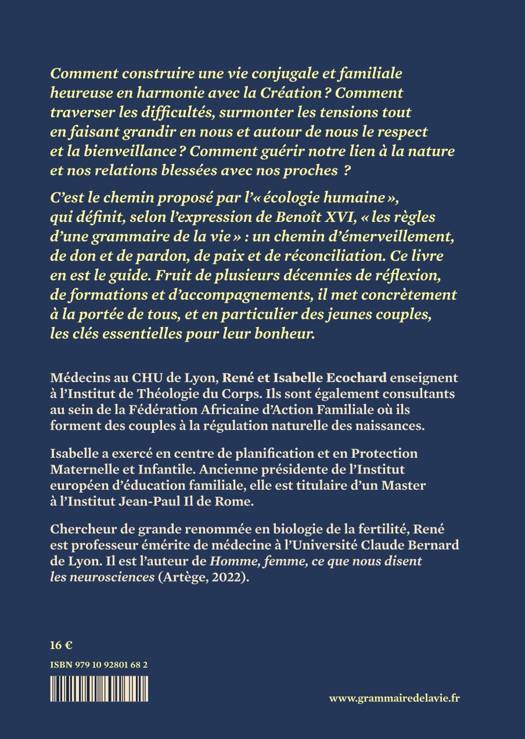 Comment construire une vie conjugale heureuse en harmonie avec la Création ? Comment traverser les difficultés, surmonter les tensions tout en faisant grandir en nous et autour de nous le respect et la bienveillance ? Comment guérir notre lien à la nature et nos relations blessées avec nos proches ? C'est le chemin proposé par l'« écologie humaine », qui définit, selon l'expression de Benoît XVI, « les règles d'une grammaire de la vie » : un chemin d'émerveillement, de don et de pardon, de paix et de réconciliation. Ce livre en est le guide. Fruit de plusieurs décennies de réflexion, de formations et d'accompagnements, il met concrètement à la portée de tous, et en particulier des jeunes couples, les clés essentielles pour leur bonheur. AUTEUR Médecins au CHU de Lyon, René et Isabelle Ecochard enseignent à l'Institut de Théologie du Corps. Ils sont également consultants au sein de la Fédération Africaine d'Action Familiale où ils forment des couples à la régulation naturelle des naissances.