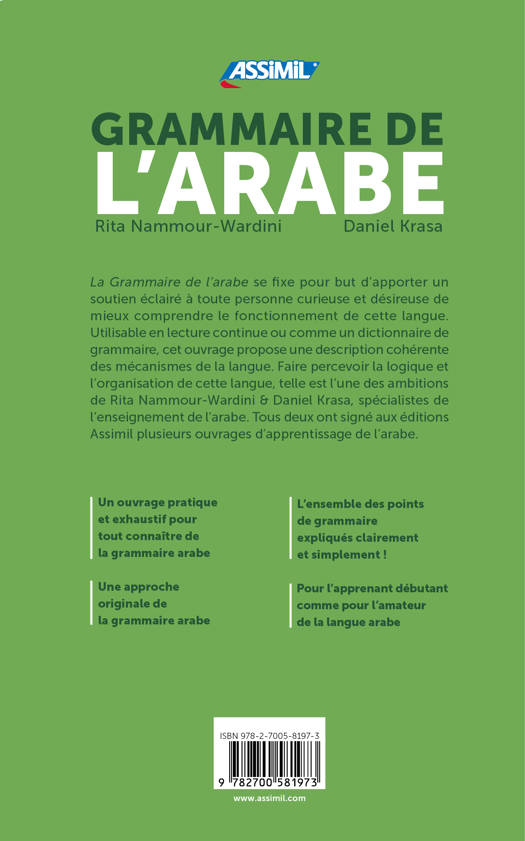 La Grammaire de l'arabe se fixe pour but d'apporter un soutien éclairé à toute personne curieuse et désireuse de mieux comprendre le fonctionnement de cette langue. Utilisable en lecture continue ou comme un dictionnaire de grammaire, cet ouvrage propose une description cohérente des mécanismes de la langue. Faire percevoir la logique et l'organisation de cette langue, telle est l'une des ambitions de Rita Nammour-Wardini & Daniel Krasa, spécialistes de l'enseignement de l'arabe. Tous deux ont signé aux éditions Assimil plusieurs ouvrages d'apprentissage de l'arabe.