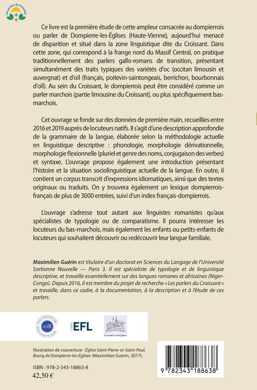 Ce livre est la première étude d'une telle ampleur consacrée au dompierrois ou parler de Dompierre-les-Églises (Haute-Vienne), aujourd'hui menacé de disparition et situé dans la zone linguistique dite du Croissant. L'ouvrage s'adresse tout autant aux linguistes romanistes qu'aux spécialistes de typologie ou de comparatisme. Il pourra intéresser les locuteurs du bas-marchois, mais également les enfants et petits-enfants qui souhaitent découvrir ou redécouvrir leur langue familiale.