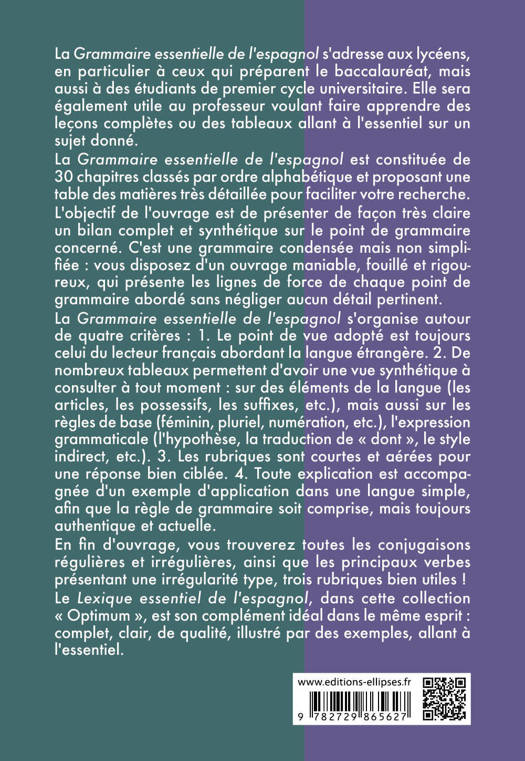 La Grammaire essentielle de l'espagnol s'adresse aux lycéens, en particulier à ceux qui préparent le baccalauréat, mais aussi à des étudiants de premier cycle universitaire. Elle sera également utile au professeur voulant faire apprendre des leçons complètes ou des tableaux allant à l'essentiel sur un sujet donné.