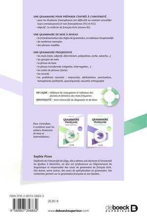 Aide à l'apprentissage de la grammaire française, cette méthode s'inscrit à côté des grammaires traditionnelles comme un outil de remédiation pour les étudiants ou les adultes, qu'ils soient non francophones ou en difficulté dans leur propre langue. Avec tests et suppléments en ligne.UNE GRAMMAIRE POUR PRÉPARER L’ENTRÉE À L’UNIVERSITÉ