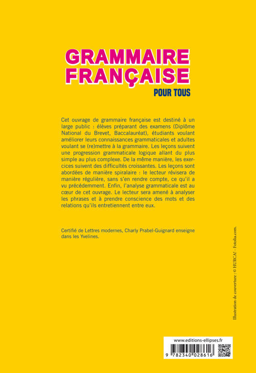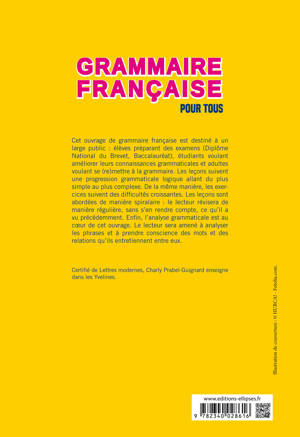 Cet ouvrage de grammaire française est destiné à un large public : élèves préparant des examens (Diplôme National du Brevet, Baccalauréat), étudiants voulant améliorer leurs connaissances grammaticales et adultes voulant se (re)mettre à la grammaire. Les leçons suivent une progression grammaticale logique allant du plus simple au plus complexe et sont accompagnées de nombreux exercices de mise en pratique et d’analyse grammaticale de niveau progressif: