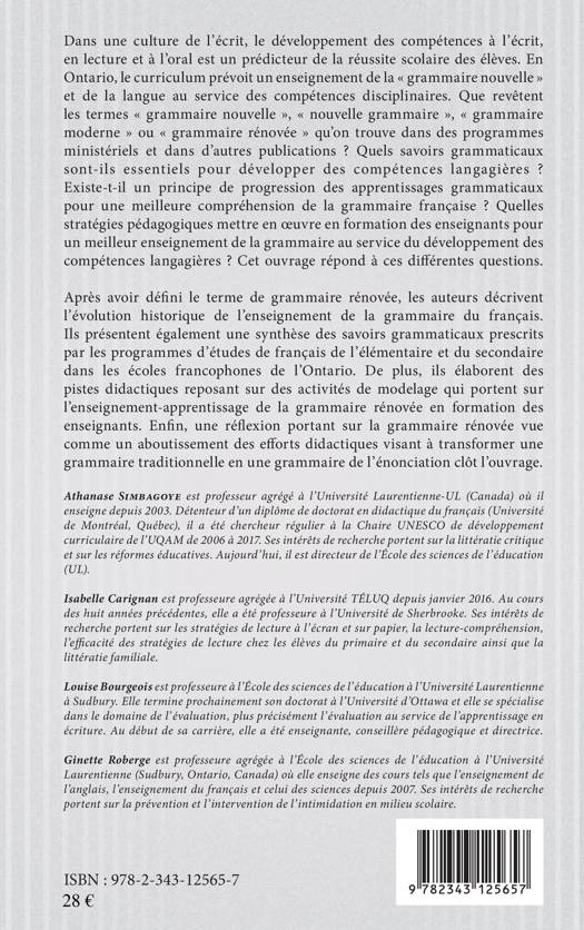 Dans une culture de l'écrit, le développement des compétences à l'écrit, en lecture et à l'oral est un prédicteur de la réussite scolaire des élèves. Dans l'Etat de l'Ontario (Canada), le curriculum prévoit un enseignement de la « grammaire nouvelle » et de la langue au service des compétences disciplinaires. Que revêt ce terme ? Quelles stratégies pédagogiques mettre en oeuvre pour un meilleur enseignement de la grammaire au service du développement des compétences langagières ? Cet ouvrage tente de répondre à ces différentes questions.
