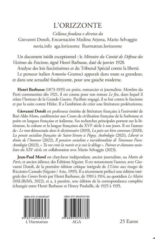 Voici un document exceptionnel pour la vie d'Antonio Gramsci, le Parti Communiste d'Italie, la montée du fascisme dans la Péninsule et les liens réels entre le philosophe révolutionnaire italien et la France : le Mémoire du Comité de défense des victimes du fascisme, signé Henri Barbusse, daté de janvier 1928. Nous comprenons que les communistes et la gauche de France perçoivent très tôt le danger de l'avance fasciste. Il est temps de réaliser une recherche profonde sur les liens entre les intellectuels français et l'uvre de Gramsci. Il y aurait de grandes surprises. La formation gramscienne est en grande partie d'origine française. La critique parle de Gramsci comme d'un marxiste 'à l'italienne'. Il est quoi qu'il en soit l'un des plus grands penseurs du XXe siècle : il se situe dans l'histoire, d'après une philosophie au service de l'homme. Ses idées sur la culture, l'État, le socialisme, le rapport entre savoir et pouvoir, la place des intellectuels dans la société, le rôle central de l'éducation et de la presse, le sens de la politique, la lutte contre le transformisme et le césarisme, font de lui un épistémologue pragmatiste. Toute sa pensée est une méthodologie du social. Gramsci est un point de repère que toute sorte de politique devrait voir comme une étoile incontournable. Penseur central du marxisme revisité, militant de l'action révolutionnaire démocratique, philosophe de la réalité de l'histoire, Gramsci met l'Être au centre de sa pensée. Il faut le relire comme l'un des nôtres, pour mieux comprendre le monde dans lequel nous vivons. La théorie gramscienne sur les rapports entre société civile et Etat est d'une actualité foudroyante. Gramsci a entrevu la déchéance du communisme soviétique. Pour le comprendre, nous devons « penser de façon gramscienne », comme dit le sociologue britannique Stuart Hall, pénétrer son projet de transition sociale, mettre au centre l'expérience de chacun de nous. Gramsci serait-il au fond resté socialiste toute sa vie ? Cela le rendrait encore plus actuel et plus moderne. On a souvent caché le véritable Gramsci. Une relecture philologique ouvre des lumières inattendues. Parce que Gramsci parle comme à nous. Pasolini a vu loin : Gramsci « dessine l'idéal qui illumine », dans une vision nouvelle du rôle des sciences humaines. C'est pourquoi Gramsci est toujours actuel, et universel, de tout temps. Il annonce une gauche moderne, capable de répondre aux grandes questions qui reviennent sous nos yeux. Un d