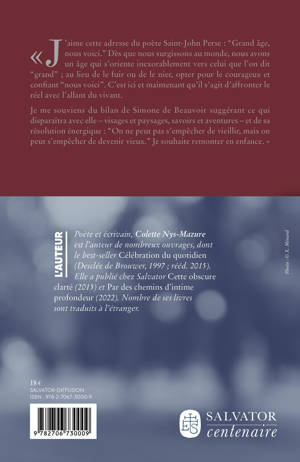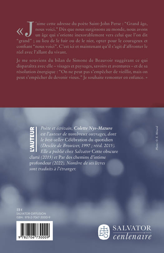 «J'aime cette adresse du poète Saint-John Perse : “Grand âge, nous voici.” Dès que nous surgissons au monde, nous avons un âge qui s'oriente inexorablement vers celui que l'on dit “grand” , au lieu de le fuir ou de le nier, opter pour le courageux et confiant “nous voici”. C'est ici et maintenant qu'il s'agit d'affronter le réel avec l'allant du vivant. Je me souviens du bilan de Simone de Beauvoir suggérant ce qui disparaîtra avec elle – visages et paysages, savoirs et aventures – et de sa résolution énergique : “On ne peut pas s'empêcher de vieillir, mais on peut s'empêcher de devenir vieux.” Je souhaite remonter en enfance. » Poète et écrivain, Colette Nys-Mazure est l'auteur de nombreux ouvrages, dont le best-seller Célébration du quotidien (Desclée de Brouwer, 1997 , rééd. 2015). Elle a publié chez Salvator Cette obscure clarté (2015) et Par des chemins d'intime profondeur (2022). Nombre de ses livres sont traduits à l'étranger.