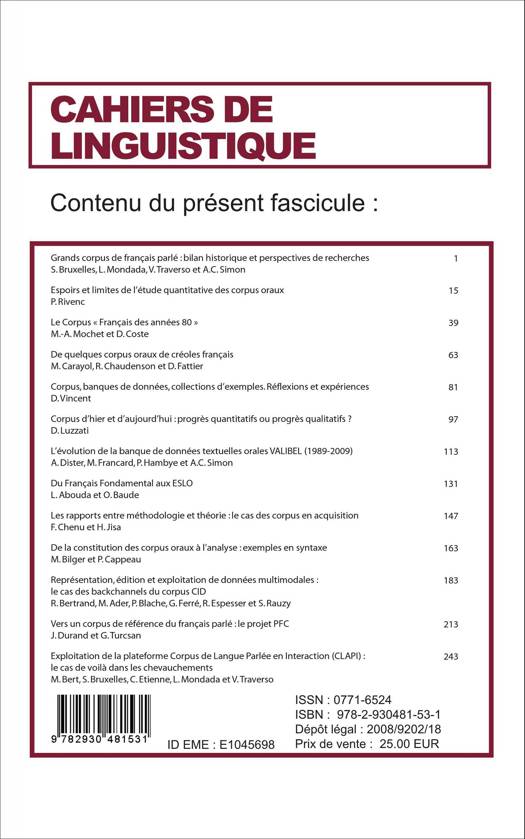 Grands corpus de français parlé : bilan historique et perspectives de recherches : S. Bruxelles, L. Mondada, V. Traverso, A. C. Simon / Espoirs et limites de l'étude quantitatives des corpus oraux : P. Rivenc / Les corpus "Français des années 80" : M-A. Mochet, D. Coste / Des quelques corpus oraux de créoles français : M. Carayol, R. Chaudenson, D. Fattier...