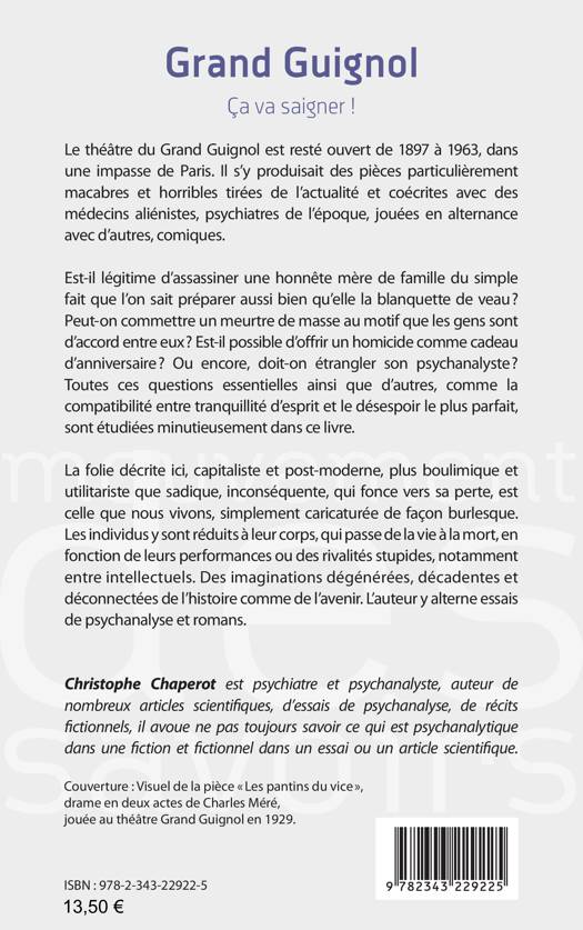 Le théâtre du Grand Guignol a produit des pièces macabres coécrites avec des médecins aliénistes et psychiatres de l’époque. Peut-on commettre un meurtre de masse au motif que les gens sont d’accord entre eux ? Est-il possible d’offrir un homicide comme cadeau d’anniversaire ? Toutes ces questions essentielles, comme la compatibilité entre tranquillité d’esprit et le désespoir le plus parfait, sont étudiées dans ce livre. La folie décrite ici, capitaliste plus utilitariste que sadique, est celle que nous vivons, simplement caricaturée de façon burlesque. Les individus y sont réduits à leur corps, qui passe de la vie à la mort, en fonction de leurs performances ou des rivalités stupides. Des imaginations dégénérées, et déconnectées de l’histoire comme de l’avenir.