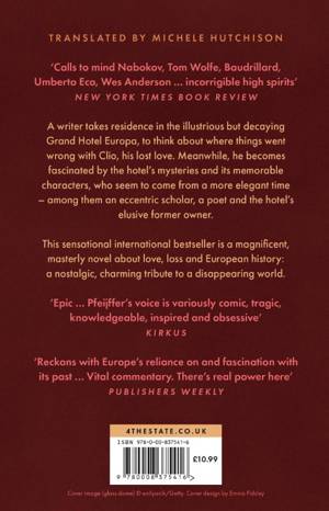 A writer takes residence in the illustrious but decaying Grand Hotel Europa, to think about where things went wrong with Clio, with whom he fell in love in Genoa and moved to Venice. He reconstructs a compelling story of love in times of mass tourism, about their trips to Malta, Palmaria, Portovenere and the Cinque Terre and their thrilling search for the last painting of Caravaggio. Meanwhile, he becomes fascinated by the mysteries of Grand Hotel Europe and gets more and more involved with the memorable c