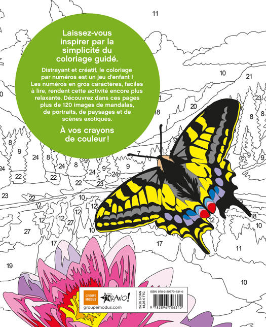 Distrayant et créatif, le coloriage par numéros est un jeu d’enfant ! Les numéros en gros caractères, faciles à lire, rendent cette activité encore plus relaxante. Découvrez dans ces pages plus de 120 images de mandalas, de portraits, de paysages et de scènes exotiques.