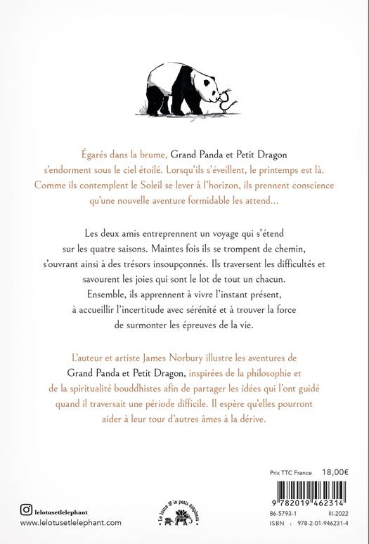 L’auteur et artiste James Norbury illustre les aventures de Grand Panda et Petit Dragon, inspirées de la philosophie et de la spiritualité bouddhistes afin de partager les idées qui l’ont guidé quand il traversait une période difficile. Il espère qu’elles pourront aider à leur tour d’autres âmes à la dérive.