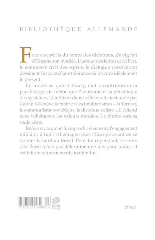 Face aux perils du temps des dictatures, Zweig fait d'Erasme son modele. L'amour des lettres et de l'art, le commerce civil des esprits, le dialogue perseverant dessinent l'espace d'une tolerance ou inscrire idealement le present.Le moderne qu'est Zweig met a contribution la psychologie de meme que l'anatomie et la genealogie des systemes. Identifiant dans la theocratie instauree par Calvin a Geneve la matrice des totalitarismes - la Terreur, le communisme sovietique, la dictature raciste -, il defend avec vehemence les valeurs morales. La plume sera sa seule arme.Refusant, ce qu'on lui reprocha vivement, l'engagement militant, il fuit l'Allemagne puis l'Europe avant de se donner la mort au Bresil. Pour lui cependant, le cours des choses n'est pas determine une fois pour toutes. Il est fait de retournements inattendus.