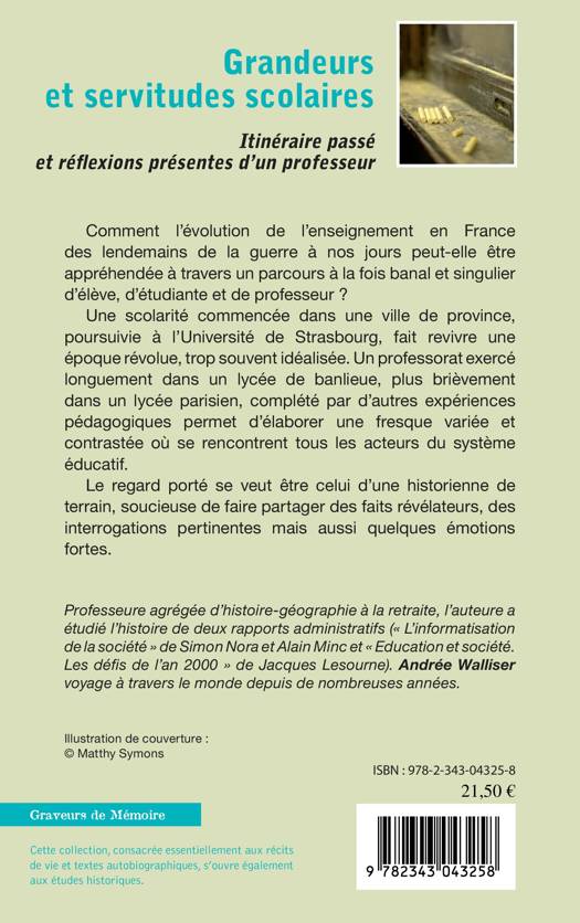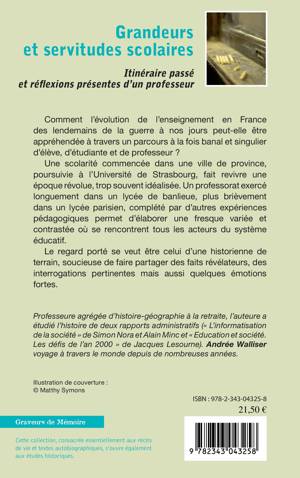 Comment l'évolution de l'enseignement en France des lendemains de la guerre à nos jours peut-elle être appréhendée à travers un parcours à la fois banal et singulier d'élève, d'étudiante et de professeur ? Une scolarité commencée dans une ville de province et poursuivie à l'Université de Strasbourg fait revivre une époque trop souvent idéalisée, puis, de nombreuses expériences pédagogiques en tant que professeur permettent d'élaborer une fresque constrastée du système éducatif.