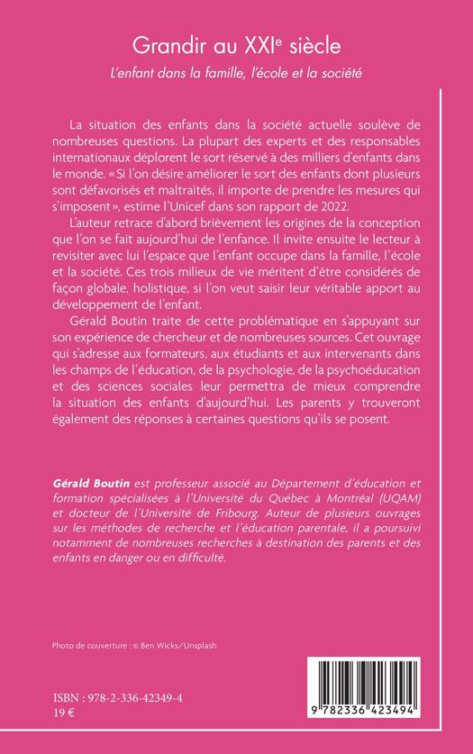Gérald Boutin traite de cette problématique en s’appuyant sur son expérience de chercheur et de nombreuses sources. Cet ouvrage qui s’adresse aux formateurs, aux étudiants et aux intervenants dans les champs de l’éducation, de la psychologie, de la psychoéducation et des sciences sociales leur permettra de mieux comprendre la situation des enfants d’aujourd’hui. Les parents y trouveront également des réponses à certaines questions qu’ils se posent.