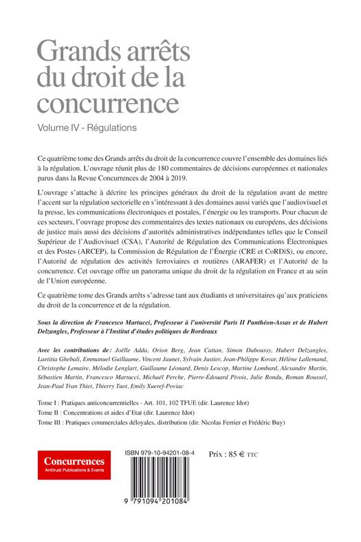 L'ouvrage s'attache à décrire les principes généraux du droit de la régulation avant de mettre l'accent sur la régulation sectorielle en s'intéressant à des domaines aussi variés que l'audiovisuel et la presse, les communications électroniques et postales, l'énergie ou les transports. Pour chacun de ces secteurs, l'ouvrage propose des commentaires des textes nationaux ou européens, des décisions de justice mais aussi des décisions d'autorités administratives indépendantes telles que le Conseil Supérieur de l'Audiovisuel (CSA), l'Autorité de Régulation des Communications Électroniques et des Postes (ARCEP), la Commission de Régulation de l'Énergie (CRE et CORDIS), ou encore, l'Autorité de régulation des activités ferroviaires et routières (ARAFER) et l'Autorité de la concurrence. Cet ouvrage offre un panorama unique du droit de la régulation en France et au sein de l'Union européenne. Ce quatrième tome des Grands arrêts s'adresse tant aux étudiants et universitaires qu'aux praticiens du droit de la concurrence et de la régulation.