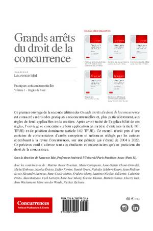 Ce premier ouvrage de la seconde édition des Grands arrêts du droit de la concurrence est consacré au droit des pratiques anticoncurrentielles et, plus particulièrement, aux règles de fond applicables en la matière. Après avoir traité de l'applicabilité de ces règles, l'ouvrage se concentre sur leur application en matière d'ententes (article 101 TFUE) et de position dominante (article 102 TFUE). Ce recueil réunit près d'une centaine de commentaires d'arrêts européens et nationaux rédigés par les auteurs contribuant à la revue Concurrences, sur une période qui s'étend de 2004 à 2022. Ce précieux outil s'adresse tant aux étudiants et universitaires qu'aux praticiens du droit de la concurrence.