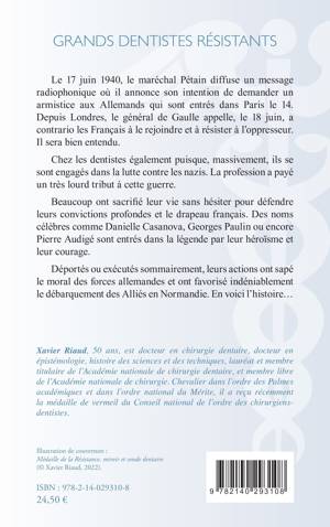 Le 17 juin 1940, le maréchal Pétain diffuse un message radiophonique où il annonce son intention de demander un armistice aux Allemands qui sont entrés dans Paris le 14. Depuis Londres, le général de Gaulle appelle, le 18 juin, a contrario les Français à le rejoindre et à résister à l'oppresseur. Il sera bien entendu. Chez les dentistes également puisque, massivement, ils se sont engagés dans la lutte contre les nazis. La profession a payé un très lourd tribut à cette guerre. Beaucoup ont sacrifié leur vie sans hésiter pour défendre leurs convictions profondes et le drapeau français. Des noms célèbres comme Danielle Casanova, Georges Paulin ou encore Pierre Audigé sont entrés dans la légende par leur héroïsme et leur courage. Déportés ou exécutés sommairement, leurs actions ont sapé le moral des forces allemandes et ont favorisé indéniablement le débarquement des Alliés en Normandie. En voici l'histoire...