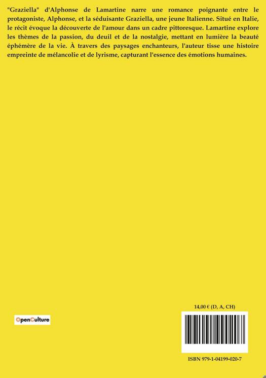 "Graziella" d'Alphonse de Lamartine narre une romance poignante entre le protagoniste, Alphonse, et la séduisante Graziella, une jeune Italienne. Situé en Italie, le récit évoque la découverte de l'amour dans un cadre pittoresque. Lamartine explore les thèmes de la passion, du deuil et de la nostalgie, mettant en lumière la beauté éphémère de la vie. À travers des paysages enchanteurs, l'auteur tisse une histoire empreinte de mélancolie et de lyrisme, capturant l'essence des émotions humaines.