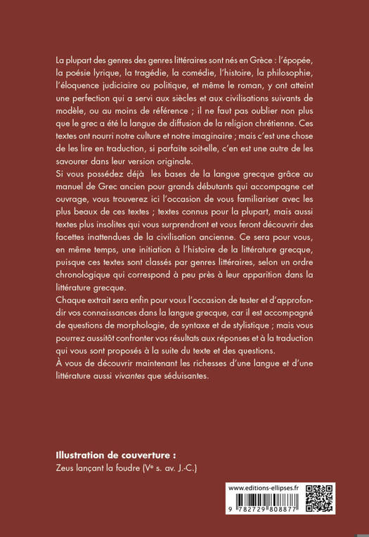 Cet ouvrage est destiné à tous ceux qui possèdent déjà les bases de la langue grecque et désirent se familiariser avec les beaux textes de la Grèce antique qui ont nourri notre culture et notre imaginaire.