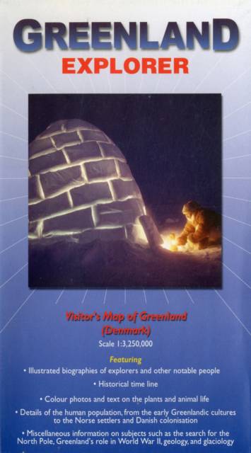 A foldout map of Greenland. It features: illustrated biographies of explorers and other notable people; a Historical time line; colour photos and text on the plants and animal life; and miscellaneous information on subjects such as the search for the North Pole, Greenland's role in World War II, Geology, and Glaciology.