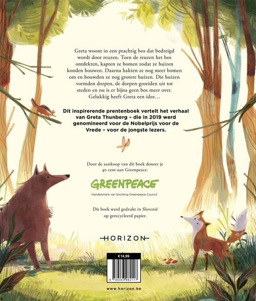 Greta woont in een prachtig bos dat wordt wordt bedreigd door reuzen. Toen de reuzen het bos ontdekten, kapten ze bomen zodat ze huizen konden bouwen. Daarna hakten ze nog meer bomen om en bouwden ze nog grotere huizen. Die huizen vormden dorpen, de dorpen groeiden uit tot steden en nu is er bijna geen bos meer over. De dieren in het bos roepen Greta's hulp in. Gelukkig heeft ze een idee...Dit prentenboek is geïnspireerd op Greta Thunbergs missie om de wereld te redden.
