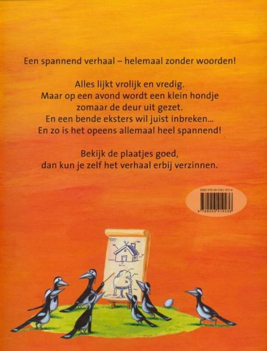 Een spannend verhaal - helemaal zonder woorden! Alles lijkt vrolijk en vredig. Maar op een avond wordt een klein hondje zomaar de deur uitgezet. En een bende eksters wil juist inbreken... En zo is het opeens allemaal heel spannend.