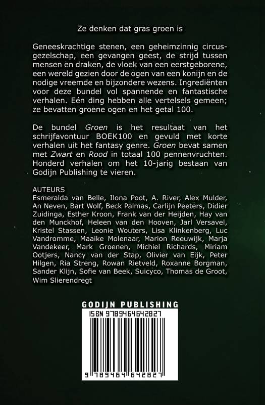 De bundel Groen is het resultaat van het schrijfavontuur BOEK100 en gevuld met korte verhalen uit het fantasy genre. Groen bevat samen met Zwart en Rood in totaal 100 pennenvruchten. Honderd verhalen om het 10-jarig bestaan van Godijn Publishing te vieren.