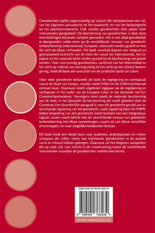 Grondrechten spelen tegenwoordig op vrijwel alle rechtsterreinen een rol, van het algemeen privaatrecht tot het staatsrecht, en van het belastingrecht tot het openbare-orderecht. Ook worden grondrechten door steeds meer instrumenten gereguleerd. De bescherming van grondrechten is door deze ontwikkelingen bijzonder complex geworden. Het is niet altijd gemakkelijk te doorgronden welke eisen op de verschillende ‘niveaus’ van grondrechtenbescherming (internationaal, Europees, nationaal) worden gesteld en hoe die zich tot elkaar verhouden. Dit boek verschaft daarom een integraal en gestructureerd overzicht van de eisen die vanuit het internationale, het Europese en het nationale recht worden gesteld bij de bescherming van grondrechten. Voor ruim twintig grondrechten, variërend van het folterverbod en het recht op vrijheid van meningsuiting tot het recht op een schone leefomgeving, biedt dit boek een overzicht van de juridische stand van zaken.