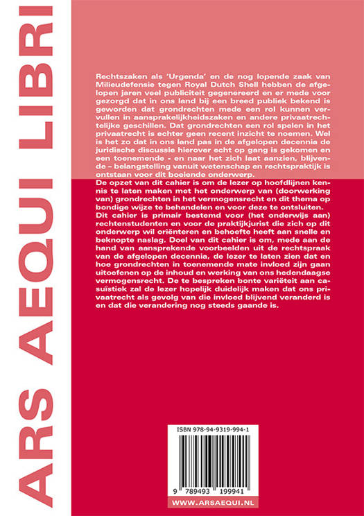 Rechtszaken als ‘Urgenda’ en de nog lopende zaak van Milieudefensie tegen Royal Dutch Shell hebben de afgelopen jaren veel publiciteit gegenereerd en er mede voor gezorgd dat in ons land bij een breed publiek bekend is geworden dat grondrechten mede een rol kunnen vervullen in aansprakelijkheidszaken en andere privaatrechtelijke geschillen. Dat grondrechten een rol spelen in het privaatrecht is echter geen recent inzicht te noemen. Wel is het zo dat in ons land pas in de afgelopen decennia de juridische discussie hierover echt op gang is gekomen en een toenemende - en naar het zich laat aanzien, blijvende – belangstelling vanuit wetenschap en rechtspraktijk is ontstaan voor dit boeiende onderwerp. De opzet van dit cahier is om de lezer op hoofdlijnen kennis te laten maken met het onderwerp van (doorwerking van) grondrechten in het vermogensrecht en dit thema op bondige wijze te behandelen en voor deze te ontsluiten. Dit cahier is primair bestemd voor (het onderwijs aan) rechtenstudenten en voor de praktijkjurist die zich op dit onderwerp wil oriënteren en behoefte heeft aan snelle en beknopte naslag. Doel van dit cahier is om, mede aan de hand van aansprekende voorbeelden uit de rechtspraak van de afgelopen decennia, de lezer te laten zien dat en hoe grondrechten in toenemende mate invloed zijn gaan uitoefenen op de inhoud en werking van ons hedendaagse vermogensrecht. De te bespreken bonte variëteit aan casuïstiek zal de lezer hopelijk duidelijk maken dat ons privaatrecht als gevolg van die invloed blijvend veranderd is en dat die verandering nog steeds gaande is.