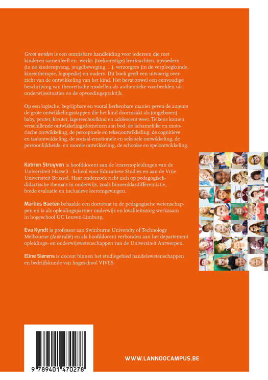 Groot worden is een onmisbare handleiding voor iedereen die met kinderen samenleeft en -werkt: (toekomstige) leerkrachten, opvoeders (in de kinderopvang, jeugdbeweging, ...), verzorgers (in de verpleegkunde, kinesitherapie, logopedie) en ouders. Dit boek geeft een uitvoerig overzicht van de ontwikkeling van het kind. Het bevat zowel een eenvoudige beschrijving van theoretische modellen als authentieke voorbeelden uit onderwijssituaties en de opvoedingspraktijk. Op een logische, begrijpbare en vooral herkenbare manier geven de auteurs de grote ontwikkelingsstappen die het kind doormaakt als (ongeboren) baby, peuter, kleuter, lagereschoolkind en adolescent weer. Telkens komen verschillende ontwikkelingsdomeinen aan bod: de lichamelijke en motorische ontwikkeling, de perceptuele en tekenontwikkeling, de cognitieve en taalontwikkeling, de sociaal-emotionele en seksuele ontwikkeling, de persoonlijkheids- en morele ontwikkeling, de schoolse en spelontwikkeling.