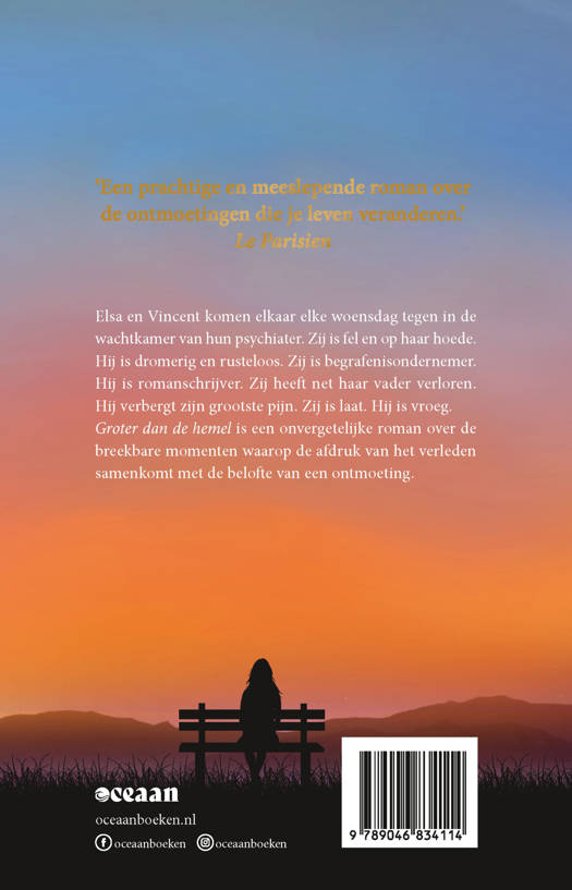 Groter dan de hemel is een onvergetelijke roman over de breekbare momenten waarop de afdruk van het verleden samenkomt met de belofte van een ontmoeting.