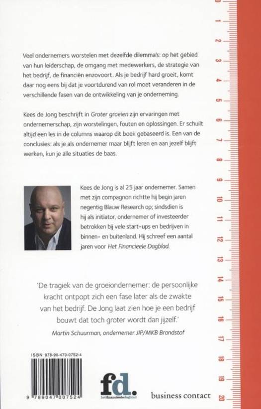 Veel ondernemers worstelen met dezelfde dilemma's: op het gebied van hun leiderschap, de omgang met medewerkers, de strategie van het bedrijf, de financiën enzovoort. Als je bedrijf hard groeit, komt daar nog eens bij dat je voortdurend van rol moet veranderen in de verschillende fasen van de ontwikkeling van je onderneming. Kees de Jong beschrijft in Groter groeien zijn ervaringen met ondernemerschap, zijn worstelingen, fouten en oplossingen. Er schuilt altijd een les in de columns waarop dit boek gebaseerd is. Een van de conclusies: als je als ondernemer maar blijft leren en aan jezelf blijft werken, kun je alle situaties de baas.