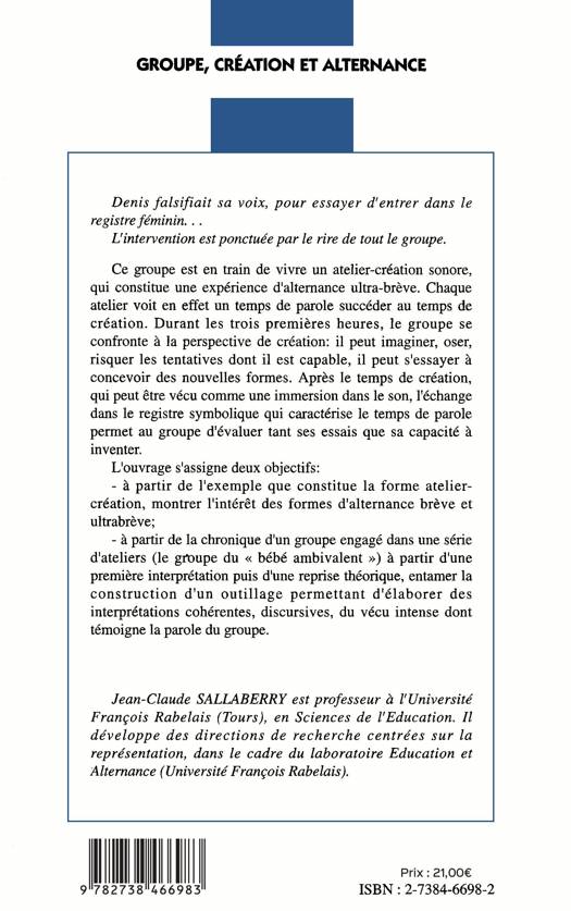 Denis falsifiait sa voix, pour essayer d'entrer dans le registre féminin... L'intervention est ponctuée par le rire de tout le groupe. Ce groupe est en train de vivre un atelier-création sonore, qui constitue une expérience d'alternance ultra-brève. Chaque atelier voit en effet un temps de parole succéder au temps de création. Durant les trois premières heures, le groupe se confronte à la perspective de création; il peut imaginer, oser, risquer les tentatives dont il est capable, il peut s'essayer à concevoir des nouvelles formes. Après le temps de création, qui peut être vécu comme une immersion dans le son, l'échange dans le registre symbolique qui caractérise le temps de parole permet au groupe d'évaluer tant ses essais que sa capacité à inventer.