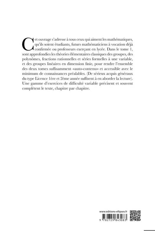 Cet ouvrage s'adresse à tous ceux qui aiment les mathématiques, qu'ils soient étudiants, futurs mathématiciens à vocation déjà confirmée ou professeurs exerçant en lycée. Dans le tome 1, sont approfondies les théories élémentaires classiques des groupes, des polynômes, fractions rationnelles et séries formelles à une variable, et des groupes linéaires en dimension finie, pour rendre l'ensemble des deux tomes suffisamment "auto-contenu" et accessible avec le minimum de connaissances préalables. (De sérieux acquis généraux du type Licence 1ère et 2ème année suffisent à en aborder la lecture). Une gamme d'exercices de difficulté variable précisent et souvent complètent le texte, chapitre par chapitre.