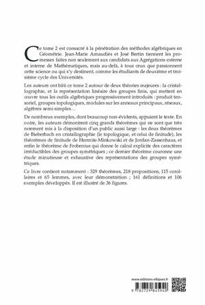 Ce tome 2 est consacré à la pénétration des méthodes algébriques en Géométrie. Jean-Marie Arnaudiès et José Bertin tiennent les promesses faites non seulement aux candidats aux Agrégations externe et interne de Mathématiques, mais au-delà, à tous ceux que passionnent cette science ou qui s'y destinent, comme les étudiants de deuxième et troisième cycle des Universités. Les auteurs ont bâti ce tome 2 autour de deux théories majeures : la cristallographie, et la représentation linéaire des groupes finis, qui mettent en œuvre tous les outils algébriques progressivement introduits : produit tensoriel, groupes topolo-giques, modules sur les anneaux principaux, réseaux, algèbres semi-simples… De nombreux exemples, dont beaucoup non-évidents, appuient le texte. En outre, les auteurs démontrent cinq grands théorèmes qui ne sont que très rarement mis à la disposition d'un Public aussi large : les deux théorèmes de Bieberbach en cristallographie (le topologique, et celui de finitude), les théorèmes de finitude de Hermite-Minkowski et de Jordan-Zassenhaus, et enfin le théorème de Frobenius qui donne le calcul explicite des caractères irréductibles des groupes symétriques ; ce dernier théorème couronne une étude minutieuse et exhaustive des représentations des groupes symétriques. Ce livre contient notamment : 329 théorèmes, 218 propositions, 115 corollaires et 65 lemmes, avec leur démonstration ; 161 définitions et 106 exemples développés. Il est illustré de 36 figures.