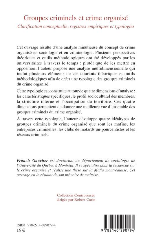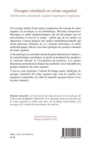 Cet ouvrage résulte d'une analyse minutieuse du concept de crime organisé en sociologie et en criminologie. Plusieurs perspectives théoriques et outils méthodologiques ont été développés par les universitaires à travers le temps: plutôt que de les mettre en opposition, l'auteur propose une analyse multidimensionnelle qui inclut plusieurs éléments de ces courants théoriques et outils méthodologiques afin de créer une typologie des groupes criminels du crime organisé. Cette typologie est construite autour de quatre dimensions d'analyse: les caractéristiques spécifiques, le profil socioculturel des membres, la structure interne et l'occupation du territoire. Ces quatre dimensions permettent de donner une meilleure vue d'ensemble des groupes criminels du crime organisé. À travers cette typologie, l'auteur développe quatre idéaltypes de groupes criminels du crime organisé que sont les mafias, les entreprises criminelles, les clubs de motards un-pourcentistes et les réseaux criminels.