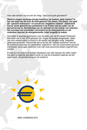 Hoe vaak denken we na over de vraag: "hoe wordt geld gecreëerd?"Waarom mogen sommige private bedrijven, de banken, geld creëren? Is het niet beter als dit door de ECB gebeurt? De auteur, Ton Derks, ziet geld als "gestold vertrouwen" en schuld als "negatieve vrijheid". Gebaseerd hierop wordt getracht een geldstelsel in te richten dat ten nutte van de gemeenschap is; dat bijdraagt aan de welvaart en het welzijn van iedereen, dat schulden van overheden vermindert en de milieutransitie en als onderdeel daarvan de energietransitie, helpt mogelijk te maken.Dit boekje is speciaal geschreven voor de leden van het Europees Parlement. Alle leden die in mei 2019 gekozen zijn, krijgen dit boekje aangeboden. Maar ook voor andere politici is inzicht in de wereld van het geld nuttig. Datzelfde geldt voor studenten. Gewoonlijk leer je bij het vak "sociale economie" hoe de economie en daarmee ons geldstelsel, ingericht is. Het vak wordt echter pas echt interessant, als je gaat nadenken over hoe onze economie anders ingericht kan worden. En last but not least is dit boekje interessant voor alle mensen die willen weten hoe geld nu eigenlijk gecreëerd wordt; en wat de invloed(en) daarvan op het eigen leven, de gemeenschap en de wereld is.