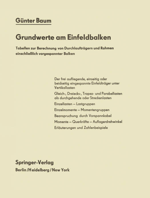 1m Zuge der allgemeinen RationalisierungsmaBnahmen sind in neuerer Zeit auch statische Berechnungen von den elektronischen Rechenzentren programmiert worden. Die Zahl der Pro- bleme, die mit Vorteil auf diese Art gelost werden konnen, ist jedoch noch sehr begrenzt, teils wegen der verhaltnismaBig hohen Kosten, teils wegen der Wartefristen, denen sich der Statiker nach der Zusammenstellung der Daten zwangslaufig unterziehen muB, und schluBendlich auch deshalb, weil die Programmierungsmoglichkeit der Computer begrenzt ist. Will man dennoch die statischen Berechnungen rationalisieren, so drangt sich ein anderer Weg auf: AIle Balkentragwerke - seien es Durchlauftrager oder Rahmentragwerke - basieren rechnerisch auf eingespannten oder frei gelagerten Einzelfeldern. Konnen hier die Ausgangswerte (Grund werle) schnell und fehlerfrei ermittelt werden, so ist ein wesentlicher Teil der Rechen- arbeit bereits geleistet. Das vorliegende Werk hat sich zur Aufgabe gestellt, dem Statiker diese Werte zu liefern. Es wurde versucht, in moglichst umfassender Weise aIle Belastungsfalle zu be- handeln, die in der Praxis auftreten konnen. Dabei ist es ganz natiirlich, daB ein Fall haufiger, der andere seltener auftritt. Das umfassende Programm solI dem Beniitzer des Werkes jedoch er- moglichen, nach einer kurzen Einarbeitungszeit stets mit dem gleichen Rechenschema zu arbeiten, wobei ihm die Wahl der Methode frei bleibt. Das vorliegende Werk ist entstanden als laufende Erweiterung von Tabellen, die ich fiir mein eigenes Ingenieurbiiro zusammengesteUt habe; es ist aus del' Praxis fiir die Praxis geschrieben worden. An diesel' Stelle mochte ieh Herrn Dipl. -Ing. H.