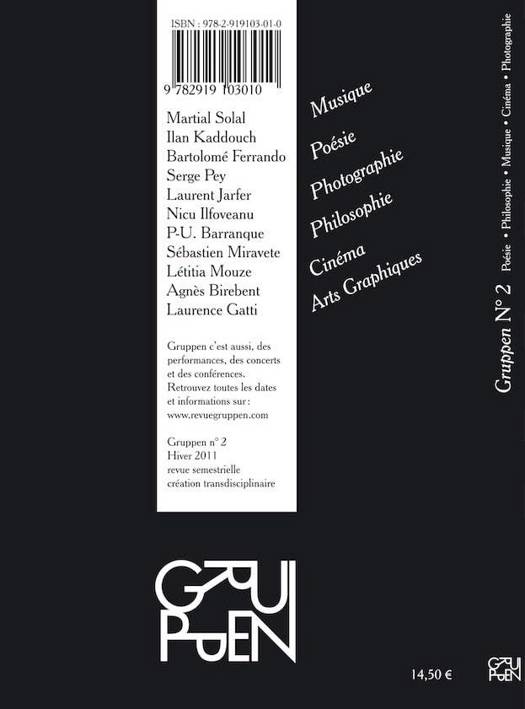 Entrevue avec MARTIAL SOLAL Poésie SERGE PEY La longue marche de Zénon dElée LAURENT JARFER Ko Taï Nan, notes de voyage pour un scénario intitulé « Dialectique du Mouvement » Musique ILAN KADDOUCH Pierre Boulez- Eclat. Un essai dextrapolation du système Photographie NICU ILFOVEANU Guide Électro-touristique (extraits) Philosophie