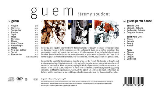 Une biographie de Guem, percussionniste, écrite par Eglantine Chabasseur, illustrée par Jeremy Soudant, accompagnée de 2 compact discs.<br /><br /> Connu du grand public pour l’indicatif de l’émission Ca se discute, connu de toutes les écoles de Danse de France et de Navarre pour son titre Le Serpent, Guem est le maître incontesté des percussions. Après 40 ans de percussions et 20 albums parus, il enchaîne infatigablement la scène, le studio et les leçons de percussion dans le quartier de la Bastille. A 70 ans, il sillonne toujours la France et le monde pour transmettre, intacte, sa passion des percussions<br /><br /> GUEM, LE MAITRE DES PERCUSSIONS<br /><br /> CD GUEM<br /><br /><br /> 1 VIAGEM (Guem) 3’16<br /> Guem : congas, djembé, karkabu<br /> Daniel : bonga<br /> From the album O UNIVERSO RITMICO<br /><br /> 2 UNIVERSO (Guem) 4’42<br /> Guem : darbuka, bonga, efeitos<br /> Daniel : congas, efeitos<br /> From the album O UNIVERSO RITMICO<br /><br /> 3 TEMPESTAD (Guem) 8’11<br /> Guem : trois têtes, bongos, djembé, congas, efeitos<br /> Daniel : congas (base e 1er solo), djembé, bonga, efeitos <br /> From the album O UNIVERSO RITMICO<br /><br /> 4 RIACHO (Guem) 8’33<br /> Riacho 1ère partie<br /> Riacho 2ème partie<br /> Guem : congas, djembé ; Daniel : tamborim, afuche ; Freddy : repique, tamborim ; J. Cebion : tamborim, caixa ; Renato : pandero, tamborim ; Don Bira : surdo; ;Théo : cuica, tamborim, agogo<br /> From the album O UNIVERSO RITMICO<br /><br /> 5 TOPIL (Guem) 5’08<br /> Guem<br /> From the album O UNIVERSO RITMICO<br /><br /> 6 MAST (Guem) 4’01<br /> Guem<br /> From the album O UNIVERSO RITMICO<br /><br /> 7 HERISSON (Guem) 4’19<br /> Guem<br /> From the album CAMELEON<br /><br /> 8 FLEUVE (Guem) 9’02<br /> Guem<br /> From the album CAMELEON<br /><br /> 9 COTE D’IVOIRE (Guem) 4’21<br /> Guem<br /> From the album COULEURS PAYS<br /><br /> 10 GUADALOUPE (Guem) 3’52<br /> Guem<br /> From the album COULEURS PAYS<br /><br /> 11 MAROC (Guem) 4’57<br /> Guem<br /> From the album COULEURS PAYS<br /><br /> 12 VENT DES SABLES (Guem) 6’19<br /> Guem<br /> From the album ROSE DES SABLES<br /><br /> 13 SECRET (Guem) 5’15<br /> Guem<br /> From the album ROSE DES SABLES<br /><br /> 14 KOUROUCTOU (Guem) 4’37<br /> Guem<br /> From the album ROSE DES SABLES<br /><br /><br /><br /><br /><br /><br /><br /><br /> DVD GUEM PERCU DANSE<br /><br /> SONG, SANNOIS LIVE <br /> Enregistré à Sanois le 1er novembre 2008 à l’Emb<br /><br /> 1 DJEMBE > TAKAMA (Guem) <br /><br /> 2 DERBOUKA > NABBOU (Guem)<br /><br /> 3 CONGAS (Guem)<br /><br /><br /> SAINT MALO LIVE <br /> Guem et son groupe ont été enregistrés à St malo le 7 février 2004 à l’Omnibus<br /> 1 MOSSE (Guem) <br /><br /> 2 DOUNGA (Guem) <br /><br /> 3 SMAAY (Guem) <br /><br /> 4 MALIBO (Guem) <br /><br /><br /> PERCU <br /><br /> 1 DJEMBE (Guem) <br /><br /> 2 BONGO (Guem) <br /><br /> 3 CONGAS (Guem) <br /><br /> 4 DERBOUKA (Guem) <br /><br /><br /> Guem on tour : Jean Marie Adell (tour manager), Rodolphe Gervais (sound engineer), Sébastien Gosnet (light engineer), <br /> Issakha Sow : djembé, bongo, congas, bells<br /> Olivier Juste :djembe, bongo<br /> Rachid Metadjer : doun doun, congas<br /> Abdelkhader Baguermi : drum<br /> Guem : djembé, bongos, congas<br /> Video Crew : Olivier André (camera 1), Cyril (camera 2), Bernardo (camera 3)<br /> GUEM, LE MAITRE DES PERCUSSIONS<br /><br /> Avant même de voir la lumière blanche du monde, Guem a ressenti ses vibrations. Dans le ventre de sa mère, il a été bercé par les rythmes du diwane, équivalent algérien du gnawa marocain, un rituel de transe, destiné à faire revivre l’âme des anciens et apaiser celle des vivants. Environ une fois par mois, toute sa famille se réunissait pour les cérémonies. Peintres en bâtiment, maçons ou femmes de ménage, les oncles et tantes savent tous jouer les instruments du diwane : le tambour doum-doum, le kourouktou, les castagnettes karkabou et le mystérieux guembri, qu’on touche uniquement les soirs de veillées, pour invoquer les esprits de la famille. La sienne est algérienne depuis trois générations, mais ses ancêtres venaient sans doute d’Afrique sub-saharienne – sa mère porte le nom de Zinder, la seconde ville du Niger.<br /> Guem naît à Batna, à l’est de l’Algérie, un beau jour de printemps de l’année 1947. Enfant, il suit l’école française et en sortant des cours, compose des rythmes sur son cartable. Certains lundis, il assiste aux cérémonies du diwane. Ces rythmes, cette ambiance familiale, mais surtout le pouvoir combiné de la musique et de la danse qui permet aux femmes de s’abandonner à la transe ou à ce vieil infirme de marcher à nouveau marque profondément Guem. La musique réunit. La musique guérit. La musique raconte. Il s’en rappellera. Quand la transe est terminée, les adultes s’arrêtent de jouer et raccrochent leurs instruments. Les enfants prennent le relais en tapant sur des boîtes de conserve. En se promenant dans les rues de Batna, Guem est intrigué par les Boussa Dia, les vagabonds à la voix d’or qui chantent des chants traditionnels ou religieux, en tapant sur un tambour avec une croche en bois. A quatorze ans, il joue dans les fêtes et les mariages et petit à petit réussit à économiser une somme rondelette : le prix d’un billet de bateau pour Marseille.<br /> On est en 1963, l’Algérie est tout juste indépendante et la France a besoin de main d’oeuvre. A seize ans, Guem est orphelin de père et de mère. Il quitte l’école. Comme beaucoup de ses compatriotes, il se décide donc à émigrer pour apprendre un métier et gagner sa vie. Sans rien dévoiler de son projet, il embarque à Alger en janvier 63 sur le « Djibel Dira », pour trente-six heures de traversée sur une mer démontée. Marseille, puis le train pour Paris, avec en poche, dix francs et sur un bout de papier, l’adresse 