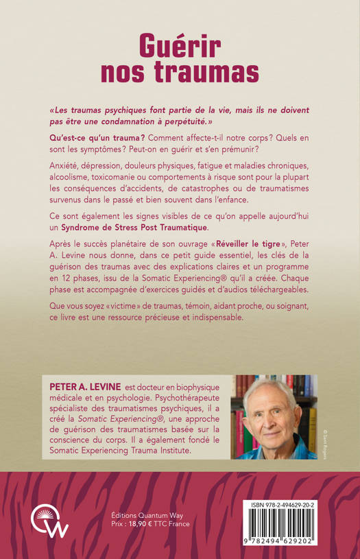 « Les traumas psychiques font partie de la vie, mais ils ne doivent pas être une condamnation à perpétuité. » Qu’est-ce qu’un trauma ? Comment affecte-t-il notre corps ? Quels en sont les symptômes ? Peut-on en guérir et s’en prémunir ? Anxiété, dépression, douleurs physiques, fatigue et maladies chroniques, alcoolisme, toxicomanie ou comportements à risque sont pour la plupart les conséquences d’accidents, de catastrophes ou de traumatismes survenus dans le passé et bien souvent dans l’enfance. Ce sont également les signes visibles de ce qu’on appelle aujourd’hui un Syndrome de Stress Post Traumatique. Après le succès planétaire de son ouvrage « Réveiller le tigre », Peter Levine nous donne, dans ce petit guide essentiel, les clés de la guérison des traumas avec des explications claires et un programme en 12 phases, issu de la Somatic Experiencing® qu’il a créée. Chaque phase est accompagnée d’exercices guidés et d’audios téléchargeables. Que vous soyez « victime » de traumas, témoin, aidant proche, ou soignant, ce livre est une ressource précieuse et indispensable. Titre original : Healing Trauma: A Pioneering Program for Restoring the Wisdom of Your Body.