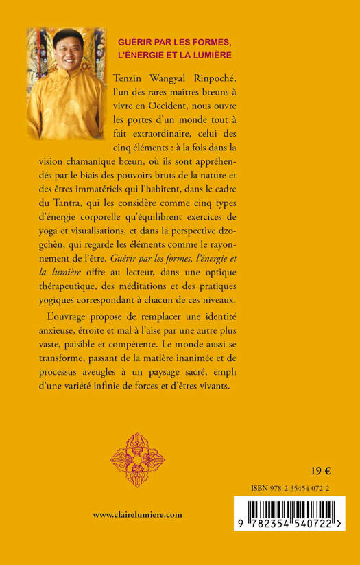 Tenzin Wangyal Rinpoché, l’un des rares maîtres bœuns à vivre en Occident, nous ouvre les portes d’un monde tout à fait extraordinaire, celui des cinq éléments : à la fois dans la vision chamanique bœun, où ils sont appréhendés par le biais des pouvoirs bruts de la nature et des êtres immatériels qui l’habitent, dans le cadre du Tantra, qui les considère comme cinq types d’énergie corporelle qu’équilibrent exercices de yoga et visualisations, et dans la perspective dzogchèn, qui regarde les éléments comme le rayonnement de l’être. Guérir par les formes, l’énergie et la lumière offre au lecteur, dans une optique thérapeutique, des méditations et des pratiques yogiques correspondant à chacun de ces niveaux. L’ouvrage propose de remplacer une identité anxieuse, étroite et mal à l’aise par une autre plus vaste, paisible et compétente. Le monde aussi se transforme, passant de la matière inanimée et de processus aveugles à un paysage sacré, empli d’une variété infinie de forces et d’êtres vivants.